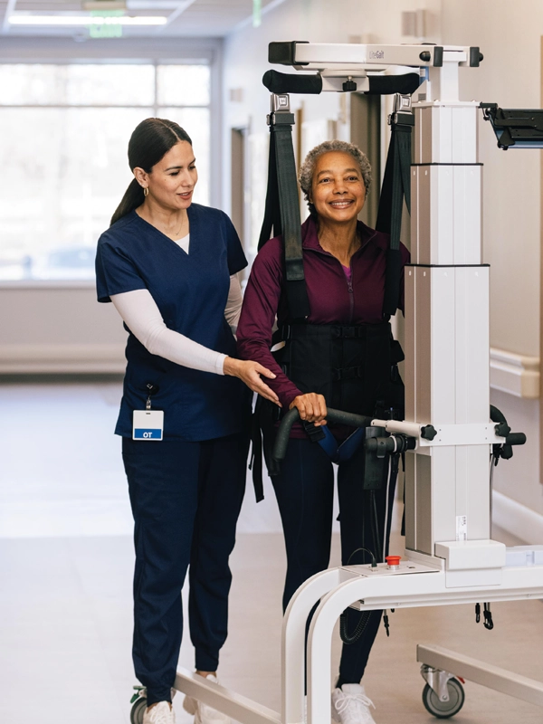 The Vector Gait and Safety System is a ceiling-mounted harness that automatically adjusts to the patient's center of gravity as they move. It allows patients to experience how it feels to fall and be caught, which can help them feel more comfortable and confident in the system to perform a variety of activities while maintaining a consistent level of body weight support. It also allows therapists to focus on the quality of movement and the overall mobility activity. The Vector can help patients with a range of mobility levels and is used to treat a variety of conditions, including stroke, brain injury, spinal cord injury, and Parkinson's disease. It can also be used for orthopedic injuries.